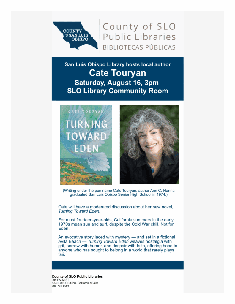 Cate and her editor are so excited to present at the San Luis Obispo Library (995 Palm Street) on Saturday, August 16 from 3:00 to 4:00. They will discuss all things Turning Toward Edenβstory inspiration, process, character, setting, themes, laughs, and more! So bring your beautiful faces and burning questions. π